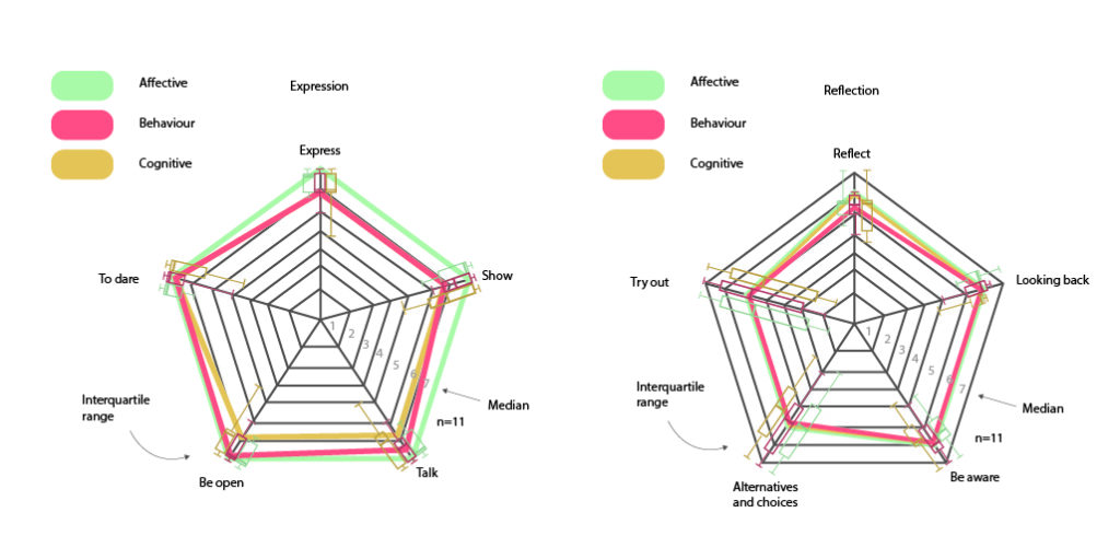 The expression of the affective component was influenced through this tangible toolkit especially on being open and daring to talk about this aspect. The affective component was also mostly reflected on in terms of reflecting on embodied feelings and basic feelings of the first three steps in reflecting, reflecting on the act itself, looking back and awareness (Korthagen, 1997). The behavioural component was again also reflected on in terms of body gestures.