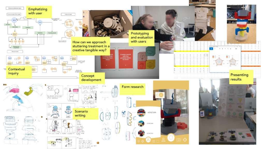 To explore whether and how a tangible toolkit could support children who stutter to express and reflect easier during therapy with their therapist, an exploratory prototype was developed in close collaboration with the children, parents and the therapists. It consist of a toolbox with blocks, a flexible standard and an application. The prototype functions as a research probe to explore how a child gives meaning to the blocks/complete puppet. It explores how a child is able to express and reflect with these blocks. Furthermore it explores how focusing on the ABC’s of the stuttering experience can support them in their treatment.